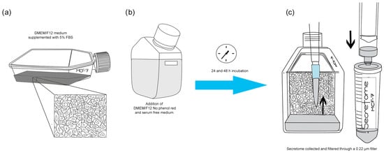 Method for obtaining the MCF-7 secretum’s. (a) The MCF-7 cell line was cultured in DMEM/F12 medium supplemented with 5% FBS until 100% confluence was reached. (b) The medium was then replaced with serum-free DMEM/F12 and incubated for 24 and 48 h. (c) After this incubation period, each secretome (24 and 48 h) was collected (↑ collection) and filtered through a 0.22 μm pore filter (↓ filtration).