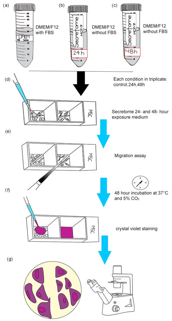 The procedure for the wound-healing assay and crystal violet staining is as follows: (a) The conditions for MSCs were classified as DMEM/F12 with 10% FBS as a control, (b) 24-h secretome, and (c) 48-h secretome. (d) MSCs exposed to 24- and 48-h secretomes. (e) A scratch was made with a fine tip for a migration assay, followed by incubation for an additional 48 h. (f) Crystal violet staining was then performed, and (g) photos were taken at 40× resolution using optical microscopy.