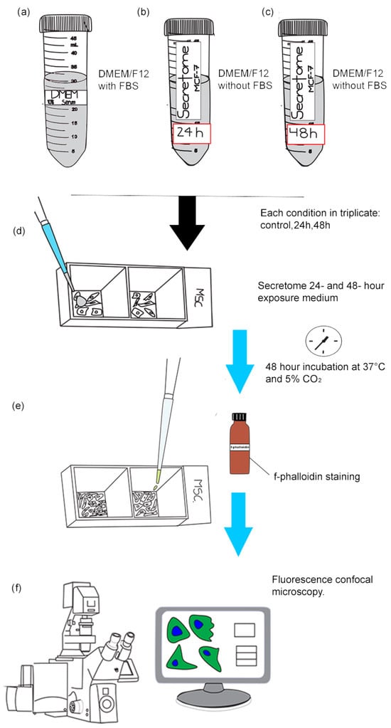 Methodological steps for MSC cytoskeleton staining with phalloidin green: (a) Negative control for MSCs: DMEM/F12 with 10% serum; (b) 24-h secretome; and (c) 48-h secretome. (d) MSCs were incubated at 37 °C and 5% CO2 for 48 h more. (e) F-phalloidin staining was performed, and (f) images were acquired using fluorescence confocal microscopy.