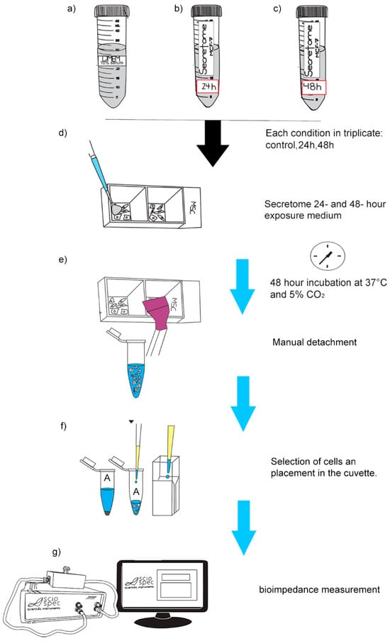 Procedure for the bioimpedance assay of MSCs. The conditions used in the assays with MSCs were as follows: (a) DMEM/F12 with 10% serum (control), (b) 24-h secretome, and (c) 48-h secretome. MSCs were incubated for an additional 48 h. Steps included the following: (d) MSCs exposed to 24- and 48-h secretome (e) cells were detached mechanically as described in the Materials and Methods; (f) selection of the cell number and placement in the corresponding cuvette (illustrated with an arbitrary sample labeled as “A”); (g) bioimpedance measurement.