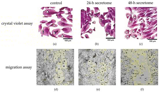 Morphology (a–c) and migration (d–f) of MSCs treated with secretomes. Cells were stained with a crystal violet stain. The conditions used in the assays of MSCs were as follows: (a,d) DMEM/F12 at 10% FBS (as a control), (b,e) 24 h secretome, and (c,f) 48 h secretome. The images were acquired via optical microscopy at 40× magnification. The symbols in the images indicate the following: * triangular shape; ⇨ spindled shape, ∆ trapezoid morphology, and ↑ stellate morphology. Spaces enclosed in yellow show wound healing not occupied by cells. Migration (d–f) was evaluated via tear assays in a wound-healing model in a monolayer of MSC culture.