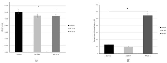 Images of the wound area stained with crystal violet were processed by converting them to binary format using the “Adjust → Threshold” function to clearly delineate the gap. A region of interest (ROI) corresponding to the wound area was defined, and the reduction in the gap area over time was measured using the “Analyze → Measure” function. This method provided an objective and reproducible assessment of wound closure, allowing for the quantification of cell migration. The percentage of gap closure was calculated by comparing the initial and final wound areas, and statistical analysis was performed to determine significant differences (p < 0.05) between the experimental groups (Figure 6b).