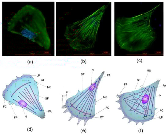 Secretomes induced changes in the disposition of cytoskeletons, as evidenced by the green fluorescence of phalloidin staining and the blue fluorescence of DAPI staining for nuclei staining (Figure 7b,c). The results showed changes in the arrangement of actin fibers in the presence of 24 and 48 h secretomes (Figure 7e,f) that differed from that of the negative control cells (Figure 7a,d), which presented the typical triangular shape without nuclear polarization. Figure 7d–f schematically illustrates the changes in the fibers of actin with a typical abundant comet tail in the membrane surface and the structures highlighted for obtaining a different morphological pattern.