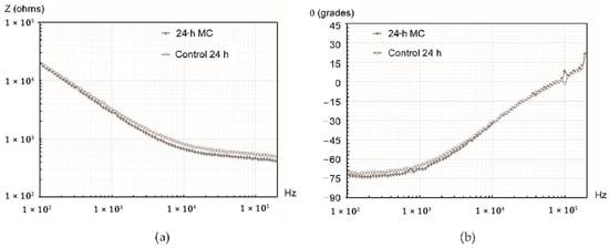 Electrical bioimpedance spectra of magnitude (a) and phase (b) for cells with the 24 h secretome. Z—magnitude; θ—phase; Hz—frequency. Magnitude and phase signatures display minimal changes with respect to the control conditions and show Zp(24h) = 0.14.
