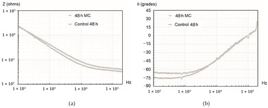 Electrical bioimpedance spectra of magnitude (a) and phase (b) for cells with the 48 h secretome. Z—magnitude; θ—phase; Hz—frequency. Magnitude and phase signatures display greater changes with respect to the control conditions and show Zp(48h) = 0.27.