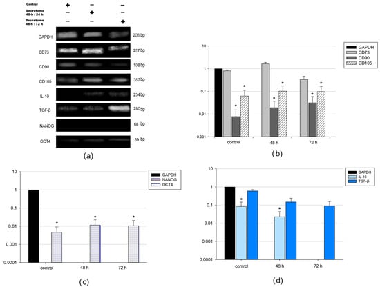 To investigate the effect of tumor-cell-conditioned 48 h media on the molecular pattern of MSCs after 48 and 72 h of treatment, RT-PCR was performed to detect CD73, CD90, and CD105 as mesenchymal cell markers (Figure 10). Additionally, IL-10 and TGF-β were evaluated as anti- and pro-inflammatory molecules, respectively. NANOG and OCT4 were used as markers of malignant transformation. The results revealed a decreased expression of CD90 at 24 h, which was evidently reduced at 72 h. ImageLab, version 6.1.0, build 7 (2020, Bio-Rad laboratories, Inc., Hercules, CA, USA) was used for the analysis of the obtained images.