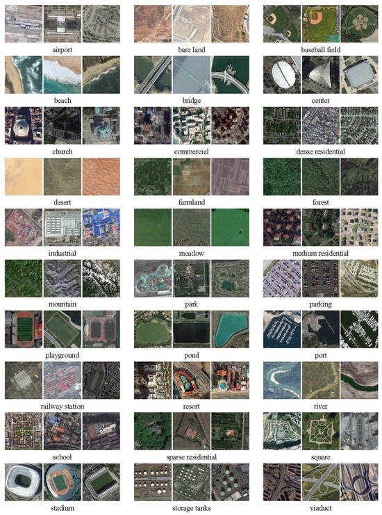 The NWPU RESISC-45 dataset has a total of 31,500 remote sensing images, each category has 700 images, and each image is 224 × 224 in size. The dataset has 45 categories: airplane, baseball diamond, basketball court, beach, bridge, chaparral, church, mountain, thermal power station, wetland, etc. For each scene class, the dataset shows great differences in viewpoint, object pose, illumination, and occlusion, etc. An example of the NWPU RESISC-45 dataset is shown in Figure 7.