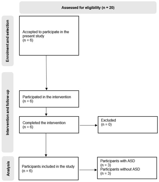 Three children aged 4 to 5 years without ASD and three children aged 4 to 5 years with ASD were included in this project. Two of the participants had grade 1 autism and one had grade 2 autism. The children with ASD included in this project were selected based on the recommendations of the schools they attended. The early intervention teams from these schools suggested the inclusion of additional motor activities to the families, as the children were not achieving the expected results in motor skills at the time. Therefore, all of these children were starting sports practice for the first time, with the goal of improving motor development through participation in guided physical activities, specifically in trampoline gymnastics.