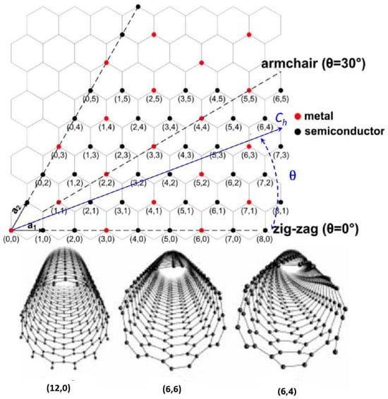 Possible wrappings of the two-dimensional graphene sheet into tubular forms. The red dots represent metallic (metal, conductive) CNTs and the black dots represent semiconductive CNTs [].