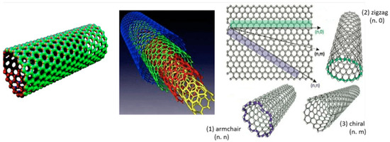 Multi-walled carbon nanotubes (MWCNTs) are cylindrical nanostructures composed of multiple layers of carbon atoms arranged in a hexagonal lattice, consisting of several SWCNTs nested within each other. In 1991, Iijima reported for the first time the synthesis of graphitic carbon needles (MWCNTs) that were 4–30 nm in diameter and up to 1 micrometer in length []. The structure of MWCNTs can be envisioned as multiple graphene sheets rolled into concentric cylinders, with the interlayer spacing approximately close to the distance (~0.35 nm) between graphene layers in graphite; the diameter of MWCNTs usually ranges between 3 and 30 nm; however, it often grows above the value of 30 nm (Figure 2) [,,,].