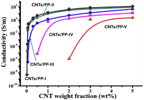 Electrical conductivity of PP composites as a function of CNTs weight fraction [].