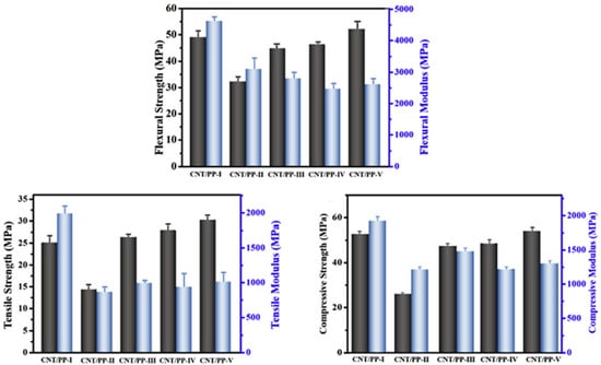 Flexural, tensile, and compressive properties of CNT/PP composites at 1.0 wt% CNT loading [].