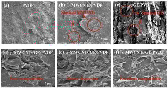 SEM images showing the dispersion states of different fillers in PVDF composites with the same content of 10 wt%. (a) Pure PVDF, (b) MWCNTs/PVDF, (c) GE/PVDF, (d) p-MWCNTs/GE/PVDF, (e) a-MWCNTs/GE/PVDF, and (f) s-MWCNTs/GE/PVDF) [].