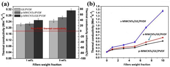 (a) Thermal conductivity of PVDF composites with GE, p-MWCNTs, and p-MWCNTs/GE. (b) Thermal conductivity of PVDF composites with different contents of s-MWCNTs/GE, a-MWCNTs/GE, and p-MWCNTs/GE [].