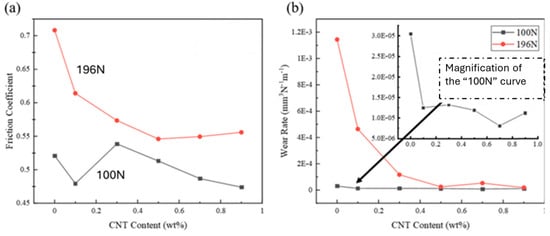 The same study also investigated friction processes by analyzing friction coefficient curves under loads of 100 N and 196 N. During the running-in stage, the friction coefficient generally increased with sliding distance, especially under higher loads due to transfer film formation and changes in surface contact. However, the friction coefficient curve of the 0.9 wt% CNT composite showed smoother behavior due to increased PPS crystallinity from a high CNT content. This higher crystallinity led to stable wear under lower loads (Figure 9). The average friction coefficient decreased for certain CNT contents, particularly at 0.5 wt%, due to a shift from adhesive to abrasive wear. The wear rate also significantly decreased with CNT addition, mainly attributed to improved heat transfer, reduced contact area, and lubricating effects of CNTs on the friction surfaces [].