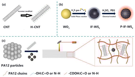 (a) Schematic diagram of the fabrication of chemically modified multi-wall carbon nanotubes (H-CNTs); (b) Schematic diagram of the fabrication of PEGylated inorganic fullerene tungsten sulfide (P-IF-WS2) nanofillers; (c) laser sintered PA12/H-CNT/P-IF-WS2 nanocomposites [].
