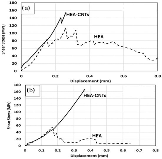 As seen in Figure 12, the introduction of CNTs significantly increased the maximum shear strength and hardness of the HEA. The addition of CNTs significantly enhanced the ultimate tensile strength and hardness of the alloy from approximately 500 to over 650 VHN. The improvements are attributed to solid solution strengthening from carbon diffusion, dispersion hardening, the pinning effect of CNTs on dislocations, and crack bridging, all of which contribute to increased mechanical strength and ductility [].