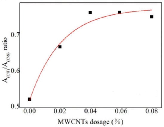 The X-ray diffraction (XRD) patterns show that no new phases were generated, indicating that the structure of the final hydration product remained unchanged in MWCNT/cement composites. The ratio of the integral areas of the CH (18 degrees) and C3S peaks (31.4 degrees) was used as an indicator of hydration degree. The integral peak area ratio of MWCNT/cement composites increased gradually with higher MWCNT dosages, indicating an accelerated cement hydration reaction (Figure 13).