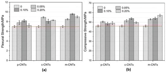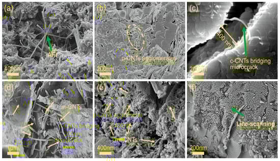 Wang et al. investigated the properties of MWCNT-reinforced cement-based composites. The study successfully used N,N-dimethylformamide (DMF) as a dispersant for MWCNTs, gradually adding it to the MWCNT solution with mechanical stirring for 10 min []. Another MWCNT–cement solution without DMF was prepared with mechanical stirring for comparison. The mixture underwent 60 min of ultrasonication in a probe sonicator. Various concentrations of MWCNTs and defoamer suspensions were mixed []. Mechanical strength increased gradually with increasing MWCNT dosages, peaking at 0.04 wt% before declining. The maximum compressive strength and flexural strength reached 77.2 MPa and 11.2 MPa, respectively, representing a 2.9% and 21.7% increase compared to the control sample. Samples with dispersed MWCNTs (with DMF) exhibited better mechanical properties compared to those with individual MWCNT dosages (without DMF). MWCNTs enhanced flexural strength while minimally affecting compressive strength. The ratio of compressive strength to flexural strength decreased by 15.9% with 0.04 wt% MWCNTs, indicating improved fracture resistance [].