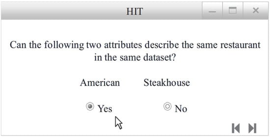The purpose of this task is to obtain the matching relationships of attribute pairs. The interface provided to the human shows a set of attributes to match, and the human analyzes the relationship of the attribute pairs and selects the answer based on his or her common sense. In the example shown in Figure 2, for example, in the Restaurant dataset, in the data record “arnie morton’s of chicago, 435 s. la cienega blv., los angeles, American” and “arnie morton’s of chicago, 435 s. la cienega blv.”, the “Type” attribute is selected and the question is asked. The task asks the human if the attributes (”American” and ”Steakhouse”) describe the same restaurant, and the human determines if ”Western” and ”Steakhouse” are the same.
