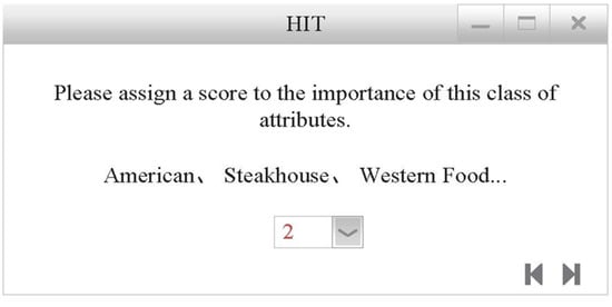 The purpose of this task is to obtain the importance of a certain class of attributes as a complement to the attribute matching task. In the interface provided to the human, a certain class of attributes is shown, and the human can rate the importance of this class based on his or her analysis. In the example shown in Figure 3, a class of attributes is displayed with the values “American”, “Steakhouse”, and “Western Food”.