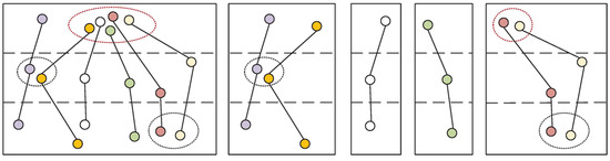 As shown in Figure 4, the current non-complete blocks are sorted according to the density ρ , each green square in the figure represents a data block, the darker color of the arrow represents the higher density of the corresponding record block, the dotted line indicates a complete block, and the purple record block indicates a divided record block. In task selection combined with the task set selection method below, priority is given to the tasks in the record blocks with high density, so the record blocks with higher density will be resolved sooner. When the record blocks are resolved as complete blocks, they are removed from the candidate matching space, i.e., the record blocks indicated in the second row of the figure. Also, the record blocks may be split according to the results returned by the manual task. The record blocks in the figure are split into red and yellow for non-complete blocks, and these record blocks in the candidate matching space are sorted according to the new density, i.e., the record blocks represented by the third row in the figure. A new batch of tasks can be selected after sorting.