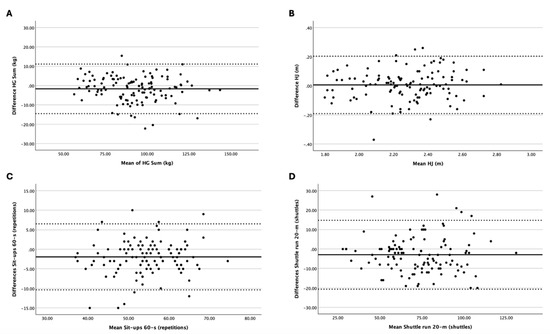 | 60 s of sit-ups (repetitions) | 54.61 ± 7.83 | 56.54 ± 7.31 | −1.93 ± 4.63 | 0.789 (0.658–0.867) | 0.48 |