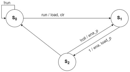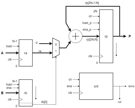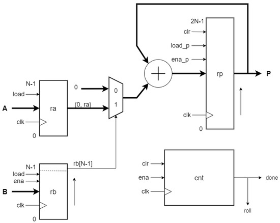In the state S0, the FSM waits for the signal run, which starts the multiplication process by switching to the state S1 and generating the signals load and clr. Since two clock cycles are required to load the results of the addition into the register rp and shift the content of the register rp, one multiplication cycle corresponds to two states, S1 and S2. When the FSM transitions from the state S1 to the state S2, the addition result is loaded into the register rp by the signal load_p, and the content shift of the register rb is performed by the signal ena. When the FSM transitions from state S2 to state S1 by the signal ena_p, the content of the register rp is shifted to the left. The multiplication process is terminated by the signal roll, and the FSM transitions to the state S0. Thus, in the traditional approach, the multiplication of N-bit numbers A and B using the algorithm c is performed in n = 2N + 1 clock cycles.
