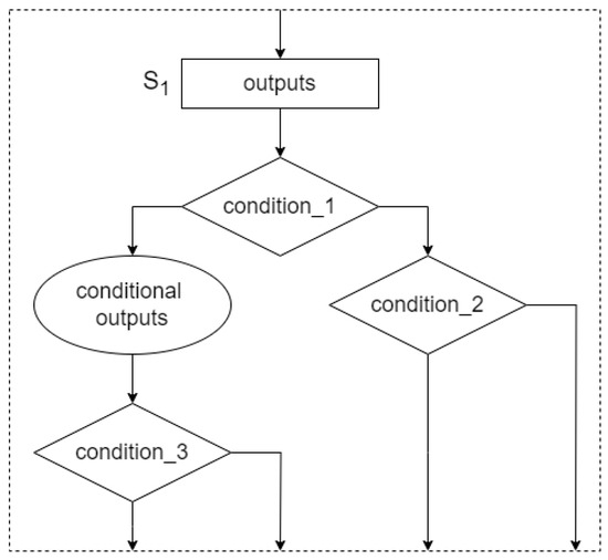 Note that the ASMD language provides more possibilities for describing the behavior of the device than the traditional approach. For example, for a Mealy FSMD in one ASMD block, it is possible to perform various variable operations sequentially, compare the obtained values with each other or with constants, and, depending on the results of the comparison, perform some operations with the same variables. Moreover, all these operations are performed in one clock cycle. Thus, with ASMD, it is possible to describe a digital device on a behavioral level, which is impossible with the traditional approach.