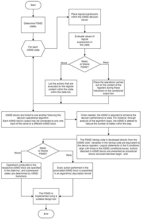 - The FSMD Verilog code is developed directly from the ASMD chart. Variables in the Verilog code are equivalent to the device registers. Logical statements in the if conditions align with those in the ASMD conditional boxes. Actions depicted in ASMD blocks are presented as procedural blocks enclosed between begin…end. For Moore FSMD, the operations conducted in the respective ASMD block are specified in the state box, and subsequent states are determined by ASMD transitions. In the case of Mealy FSMD, every action performed in the associated ASMD block is presented in an algorithmic description format.
