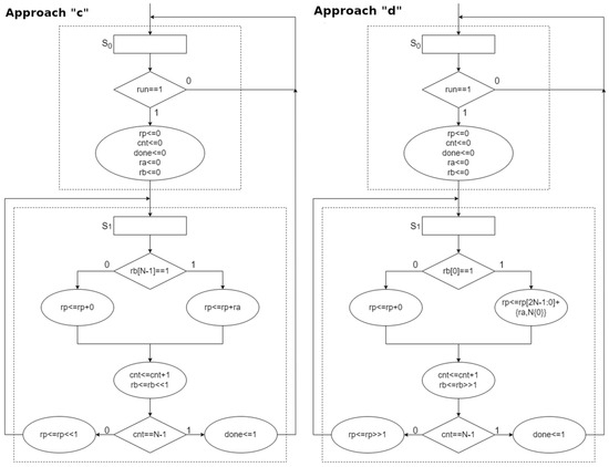 The ASMD chart of the multiplication algorithm c (Figure 6, on the left) consists of two ASMD blocks, which correspond to the states S0 and S1 of Mealy’s FSMD. State S0 waits for the signal run, when run = 1 the variables are initialized. State S1 corresponds to the multiplication loop. When rb[N − 1] = 1, the multiplicand value is added to the content of the register rp; otherwise, nothing is added. The counter cnt value is then incremented, and the content of the register rb is shifted to the left. The value of the counter cnt is checked in the same ASMD block. If cnt = N − 1, then the flag done is set, and the multiplication process ends. Otherwise, the content of the register rp is shifted to the left, and the multiplication cycle is repeated.
