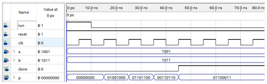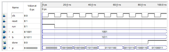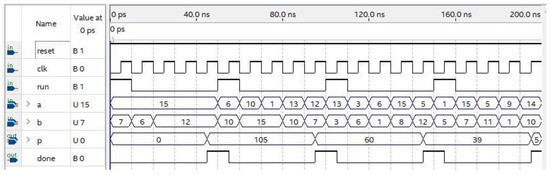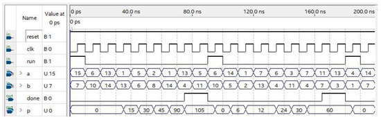 The simulation results of the project mult_c_Mealy_FSMD in the tool Quartus Prime are shown in Figure 7. It shows that the multiplication of 4-bit numbers is performed in five clock cycles, i.e., the multiplication of N-bit numbers is performed in N + 1 clock cycles. For comparison, Figure 8 shows the simulation results of the synchronous multiplier, which implements the algorithm of multiplication c, which was designed by the traditional approach. Figure 8 shows that the multiplication of 4-bit numbers is performed in nine clock cycles.
