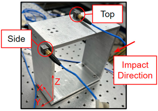 The dominant frequencies of the box assembly systems under consideration were estimated through a free vibration test by hitting the system with a modal impact hammer with a blue soft tip. In order to excite the first mode of each system, the BA was impacted in the Y-direction, as indicated in Figure 2. It should be mentioned that spacers were used at the bolted connections on the base of each system to accurately explore the dynamics of the systems with the considered set of boundary conditions [24]. In fact, the inclusion of the space nuts prevented any interference between the box assembly base motion and the table holding it. In this way, the box assembly could freely vibrate beyond the horizontal plane.