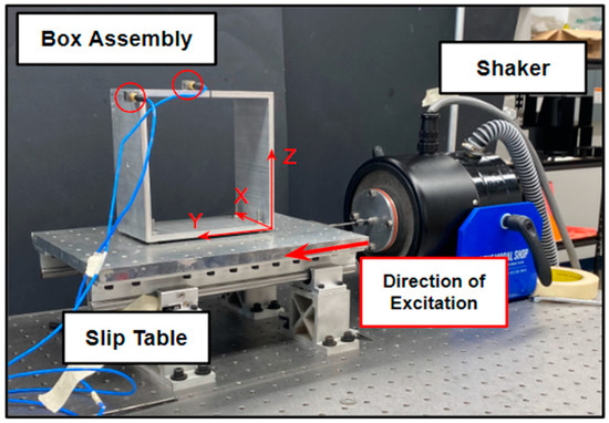 To achieve a comprehensive insight into the dynamics of the four box assembly configurations and how the central cut influences the dynamical properties of these systems, pseudorandom vibration tests were performed in the Y-direction with four increasing levels of excitation. The experimental setup for random excitation is depicted in Figure 3. This setup consists of an extended slip table with a stinger attached to a smart table. The BA structures were fixed to the extended slip table via a bolted-joint connection. In addition to the two main accelerometers attached to the box assembly, an additional accelerometer served as a reference point on the base of the slip table.