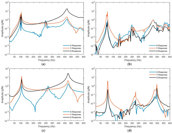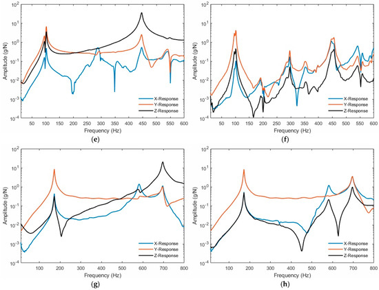 The impact testing results for the no central cut box assembly configuration are shown in Figure 4g,h. The dynamics of this system are slightly different than those with a central cut, but the basic characteristics are still comparable. Once again, the first mode is dominated by a moving displacement in the Y-direction, and this is shown in the response from both the top and side accelerometer. As for the second mode, which is near 600 Hz, the X-direction in both accelerometers is the most dominant, as shown in Figure 4g,h. On the other hand, for mode 3 (around 700 Hz), it is clear that the top accelerometer is mostly moving in the Z-direction and the side accelerometer has more oscillations in the Y-direction.