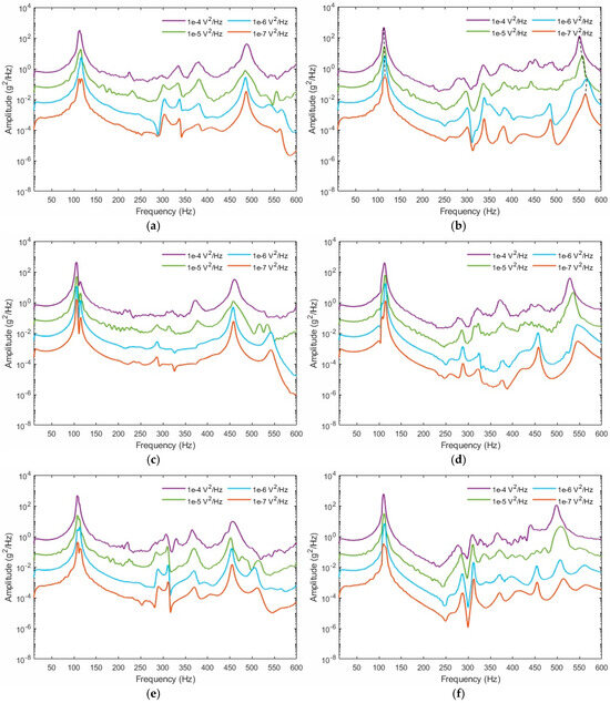 The second set of experiments performed on the box assembly systems is through random vibration tests. The setup was described previously in Section 2. Random testing gives a qualitative understanding of the dynamics of each system. A pseudorandom excitation is considered for this testing because of the interest in the nonlinear characteristics that can be determined by incrementally increasing the excitation levels. Thirty averages were performed in each test to ensure that the data shown in the power spectral density (PSD) plots could be clearly read. Pseudorandom excitation gives a constant amplitude and periodicity in the sample interval, which allows for sensitivity to nonlinearities. The trends that can be observed are done so by dividing the output response by the input signal [37]. Through this testing, an analysis of how the system reacts over a range of frequencies under various excitation levels is observed. Specialty trends are to be expected, varying between nonlinear softening, hardening, and/or damping. These findings will be investigated and discussed later in this study.