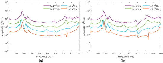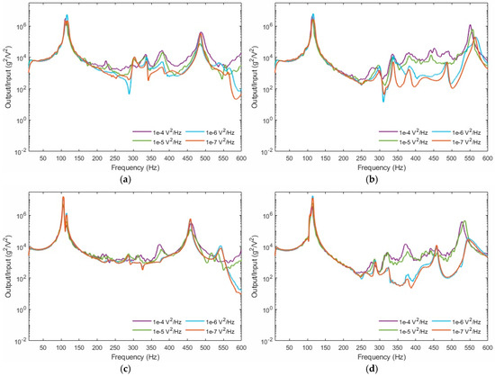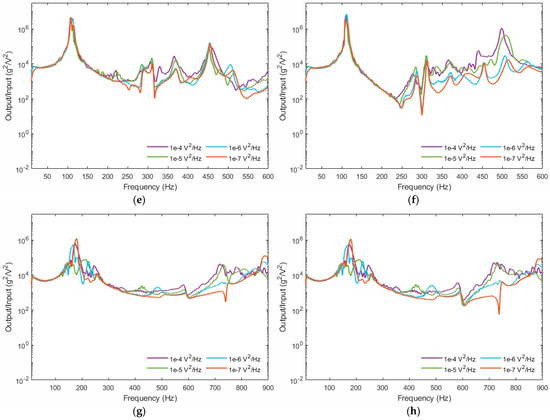 Figure 5 shows the PSD results from all the central cut widths for four different input levels of excitations. Both top and side Y-direction accelerometer results are plotted in Figure 5a,c,e,g and Figure 5b,d,f,h, respectively. Inspecting these subfigures, it can be observed that all the experimental results show similar trends for the different central cut configurations. Again, the focus will be on modes 1(b) and modes 3(b) from Table 3 and Table 4. Notice that the highest responses are from these modes, since this is the direction that has the largest dynamical movement in the Y-direction for the side accelerometer. These modes peak at approximately 105–120 Hz and 500–550 Hz, respectively, depending on the cut width being observed. From the plotted graphs in Figure 5b,d,f for the various central cut widths, it can be observed that an increase in the input excitation is accompanied by a decrease in the dominant frequency near the first and third modes. This is a characteristic of the presence of a nonlinear softening in the box assembly configurations with cuts. An example of a nonlinear softening trend is seen in Figure 5b.