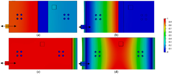 Top-down view of 0.5” cut (a) mode 1b and (b) mode 3b and no cut (c) mode 1 and (d) mode 3 including a normalized color bar.