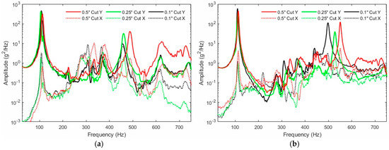 Shown in Figure 6 are the output/input plots found for the various box assembly systems from the Y-direction of the top and side accelerometers. Comparing all the systems with a cut, similar trends are observed. Once again, the results are compared to the mode shapes found in Table 3 and Table 4. For example, immediately seen are the highest responses at approximately 110–120 Hz in all the systems with a cut. This is expected since mode 1(b) in Table 3 are moving primarily in the Y-direction on the side with the accelerometer, as shown in Figure 6a. No other mode is expected to have that high displacement since no other mode is moving as much in that direction. The next mode of particular interest is mode 3, particularly mode 3(b) of all the central cut systems since that side is moving with the accelerometer. Though very slight, the side accelerometer is moving in the Y-direction, as shown in Figure 7b. Here, in the third mode of the system around 500–550 Hz, a nonlinear damping trend is observed. This trend is present in the lower modes, but not as evident as it is in the higher modes of interest.