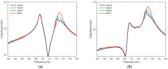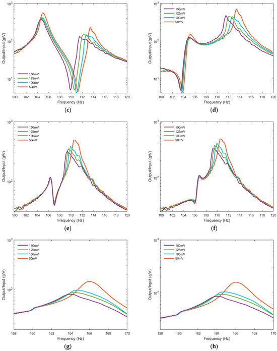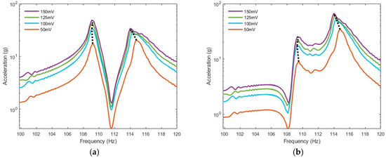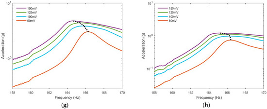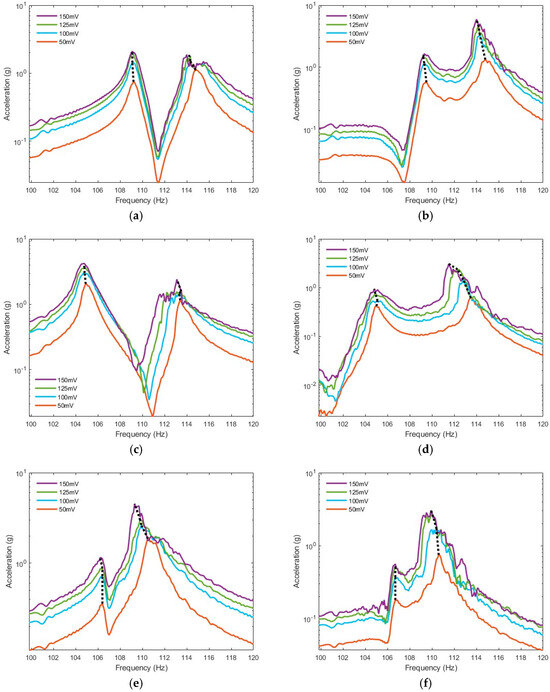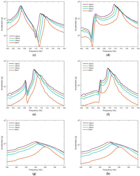 Figure 10 depicts the results of the Y-direction harmonic testing performed on each box assembly system. The experimental setup can be found in Figure 3. Harmonic testing gives a quantitative analysis of the system’s dynamics. Each box assembly system was excited at four different input levels of excitation, namely, 50 mV, 100 mV, 125 mV, and 150 mV. The harmonic tests were focused around the first mode of vibration in order to effectively characterize the dynamical properties of these systems and how the possible uncertainty or change in the central cut width influences the system’s response. It follows from the plots in Figure 10 that a nonlinear softening trend is present in each system, showing similar results to the random vibration tests. Again, as the excitation level increases, the resonant frequency decreases. It should be noticed that two resonant frequencies are present in each system, which again confirms the asymmetry seen earlier in the FEA and impact tests due to the placement of the accelerometers.