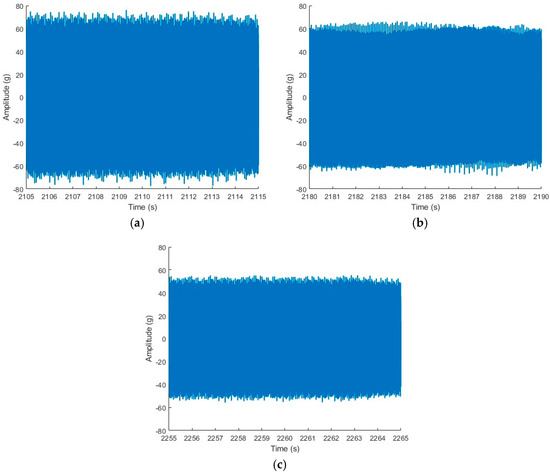 Time history of the 0.5” cut case near resonance from the side accelerometer at 150 mV excitation, showing (a) 114 Hz (resonance), (b) 114.5 Hz, and (c) 115 Hz.