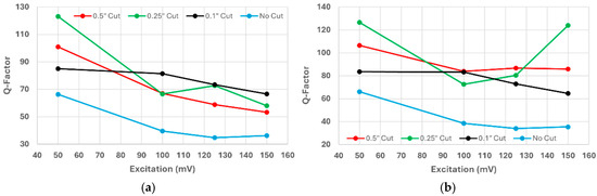 First, the quality factor for each accelerometer in the Y-direction was calculated and is depicted in Figure 14. Finding the quality factor allows for a better understanding of the nonlinear damping present in the system, particularly since the resonant frequency does not vary much in terms of percentage (less than 1.5%) for all the box assembly configurations, as shown in Table 11. As demonstrated earlier, the first modes 1(a) and 1(b) are mostly oscillating in the Y-direction. Further, the X-direction plots have a lot of variability due to the low levels of output amplitudes and the existence of several harmonics in the time history, so the main focus in this section is on the Y-direction results. The Y-direction quality factors’ plots show that as the input excitation level increases, the quality factor decreases, as shown in Figure 14a,b. Since the quality factor is decreasing, the nonlinear trend has a higher effect as the excitation level increases. This means that the nonlinear damping has a higher effect as the excitation level increases. The outlier is the 0.25” cut system in the side accelerometer Y plot. The trend is not the same as the others, instead decreasing and then increasing back at the higher excitations. One of the possible reasons is the presence of several harmonics in the time histories of the experimental data and hence, the possible uncertainties in the estimation of the amplitudes of oscillation at the quality factor’s corresponding frequencies. It should be mentioned that efforts are made during experiments to ensure that all the joints are torqued the same before each test, but some uncertainties from preload loss could be credited to the damping in each system. It is possible that the torque of the joints changed throughout each test, which cannot be controlled without disturbing each experiment.