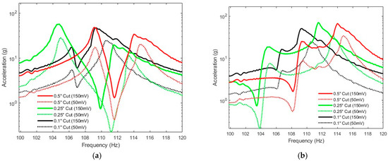 Inspecting the frequency response curves of both the top and side accelerometers in Figure 9, it is noted that the oscillating amplitudes for the first and second resonant peaks are higher for the top and side accelerometers, respectively, for both the 0.5” and 0.25” central cut width scenarios. On the other hand, the 0.1” central cut width configuration shows that the oscillating acceleration amplitude of the second resonant peak is higher than the first resonant frequency counterpart for both the top and side accelerometers, as shown in Figure 10e,f. This means that the side accelerometer’s motion is more significant than the top accelerometer’s one. As for the side accelerometer’s amplitudes, they are always higher for their corresponding mode 1(b) for all the width cut configurations, as presented in Figure 10b,d,f. It should be mentioned that an anti-resonance behavior takes place between the two resonant peaks, and this is particularly true for the top accelerometer’s results.