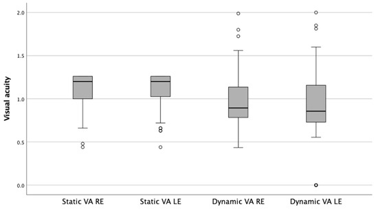 Monocular static and dynamic visual acuity. Box = 1 standard deviation, line = median, whiskers = confidence interval (95%), o = outlier, VA = visual acuity, RE = right eye, LE = left eye.