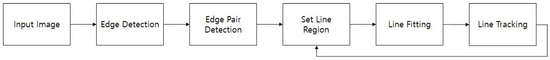 As illustrated in Figure 2, the proposed method performs edge detection once an input image is received. Initially, the color image is converted to grayscale for edge detection. The Sobel edge detection method was applied in the vertical direction because the lane markings were oriented vertically. Equation (1) represents Sobel edge detection [20,21].