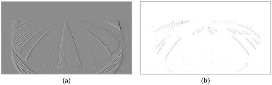 Figure 3a illustrates the edge detection results. As shown Figure 3a, the lane-marking edges are composed of both positive and negative edges. Using the characteristics of lane markings, candidate lane markings are extracted by identifying edge pairs in which a positive edge is followed by a negative edge [22]. For each edge pair, a positive edge appears first, followed by a negative edge, based on the image coordinates. Figure 3b shows the results of using edge pairs. The negative edge was retained for the left-lane marking to extract the inner edge relative to the ego lane, whereas the positive edge was retained for the right-lane marking.
