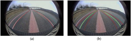 Figure 4a shows the results of the lane fitting. Figure 4b shows the results of the lane-tracking range determination.