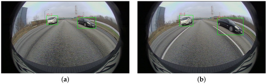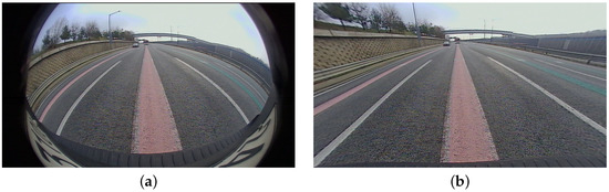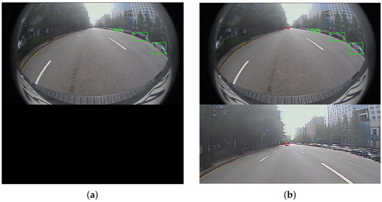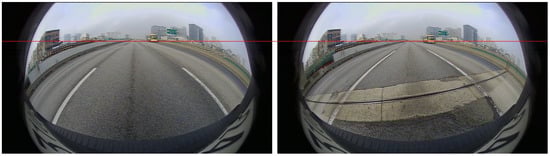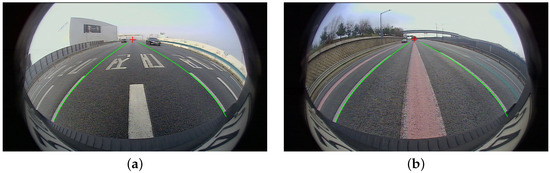 Figure 5 shows the distortion correction results for the fisheye lens obtained using Equation (4). Figure 5a presents the distorted image, whereas Figure 5b displays the result after distortion correction. The lane markings, which appear as curves in Figure 5a, are represented as straight lines in Figure 5b following the correction.