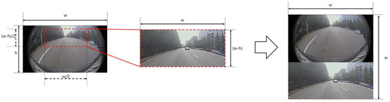 As shown in Figure 8, an ROI containing both lanes is set using the vanishing point determined from the lane information. The set ROI is resized twice horizontally and vertically to create a single image. This process allows for the detection of objects that are twice as large within the ROI.