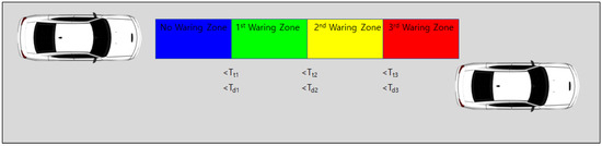 The blind-spot detection warning was determined based on the distance to the object and the estimated time to collision. Figure 11 illustrates the defined warning zones.